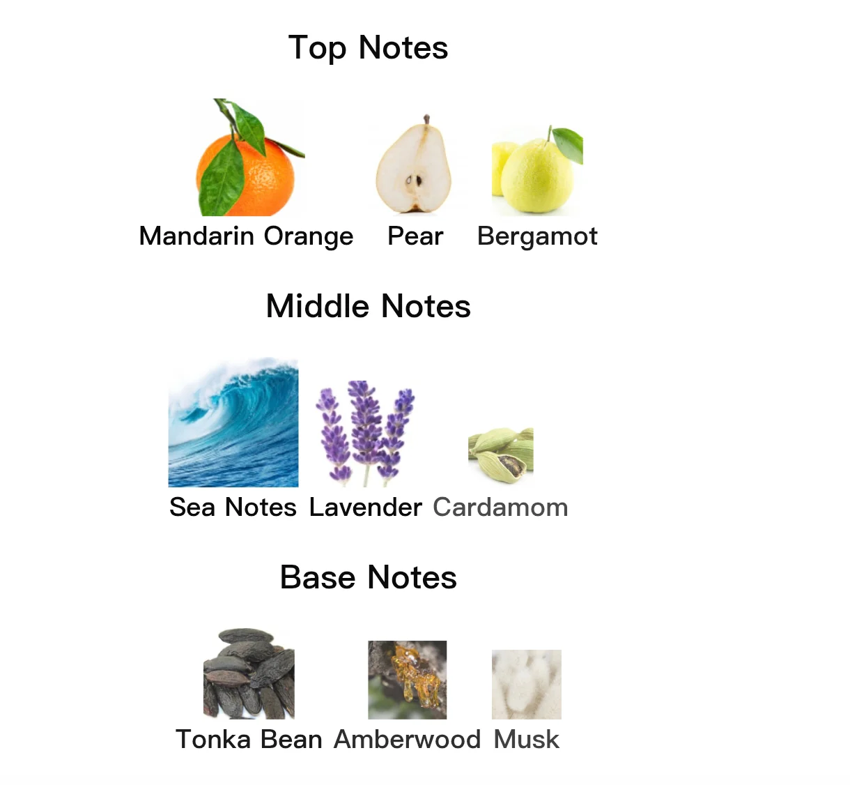 Top notes are Mandarin Orange, Pear and Bergamot; middle notes are Sea Notes, Lavender and Cardamom; base notes are Tonka Bean, Amberwood and Musk.